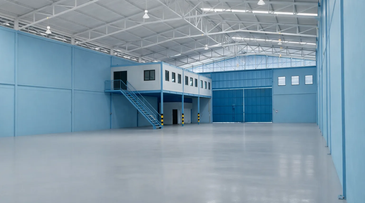 Металлический ангар с устаревшим покрытием. Задача комплексная — не просто обновить внешний вид, а выполнить полный цикл: зачистка старого слоя, огнезащитная обработка металлоконструкций и финишная покраска.