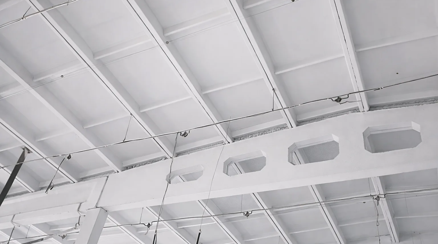 Большое промышленное помещение в Домодедово. Потолки с многолетним покрытием — частично отслаивающимся, загрязнённым, потемневшим. 11 000 м² под потолком.