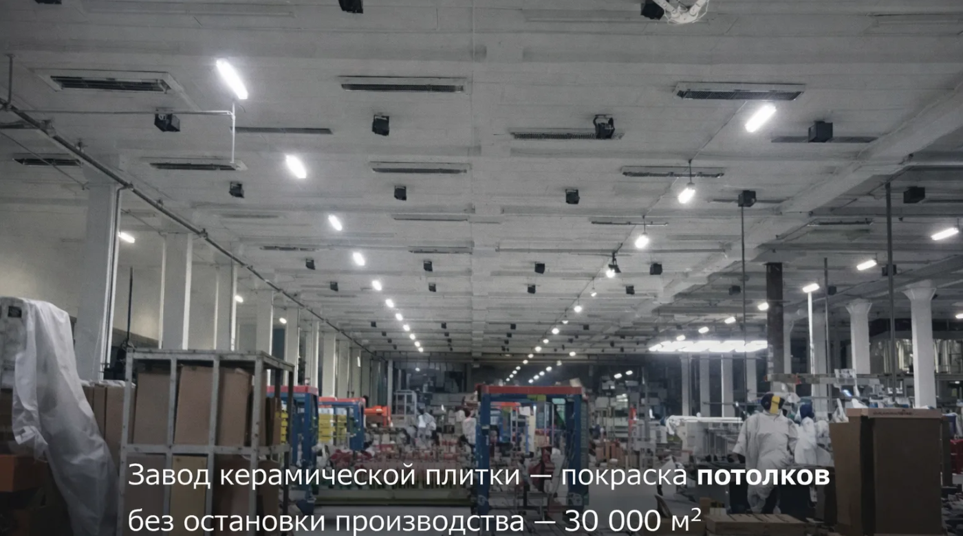 Завод не потерял ни одной смены. Производство керамической плитки шло в штатном режиме всё время пока мы красили потолок.