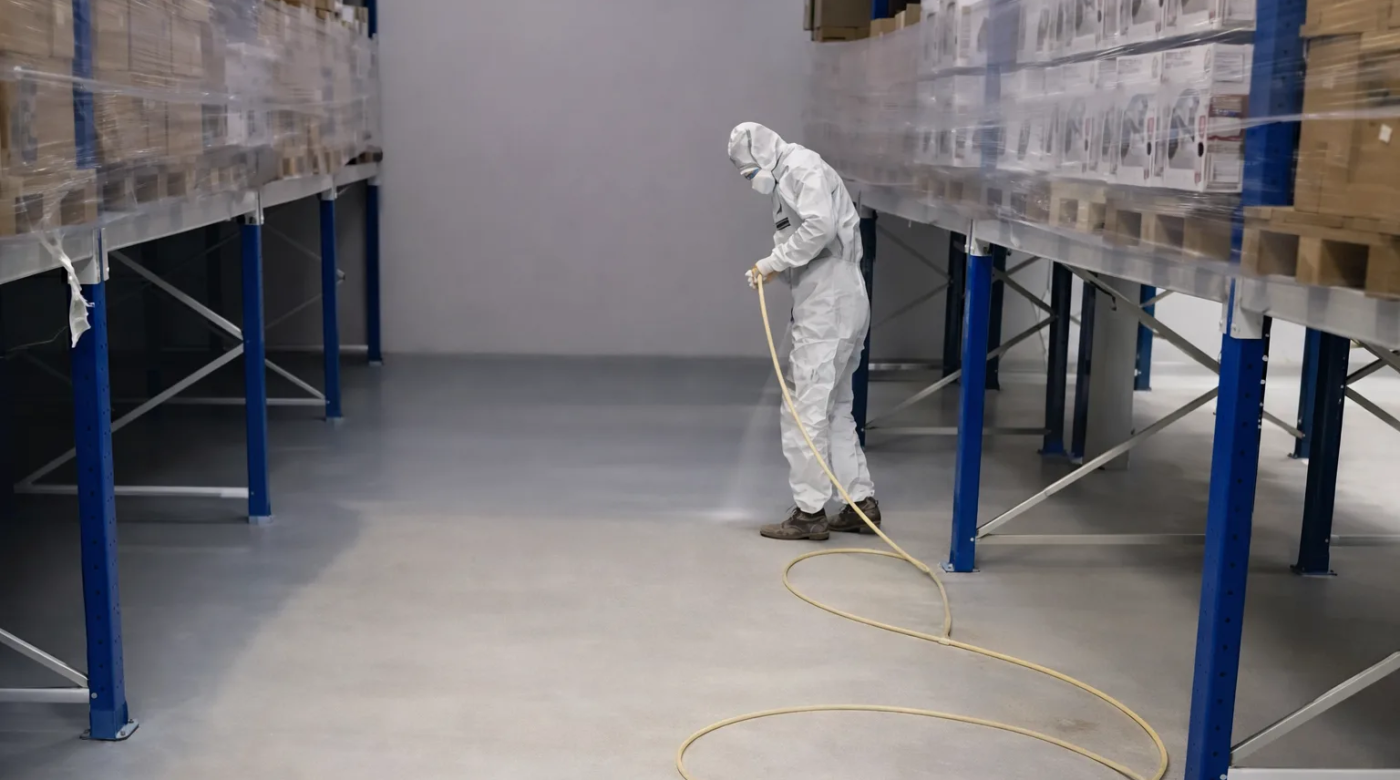 Экопол связывает бетон и прекращает пыление. Два слоя — и проблема решена. Без переезда товара, без закрытия склада, без многодневного простоя.