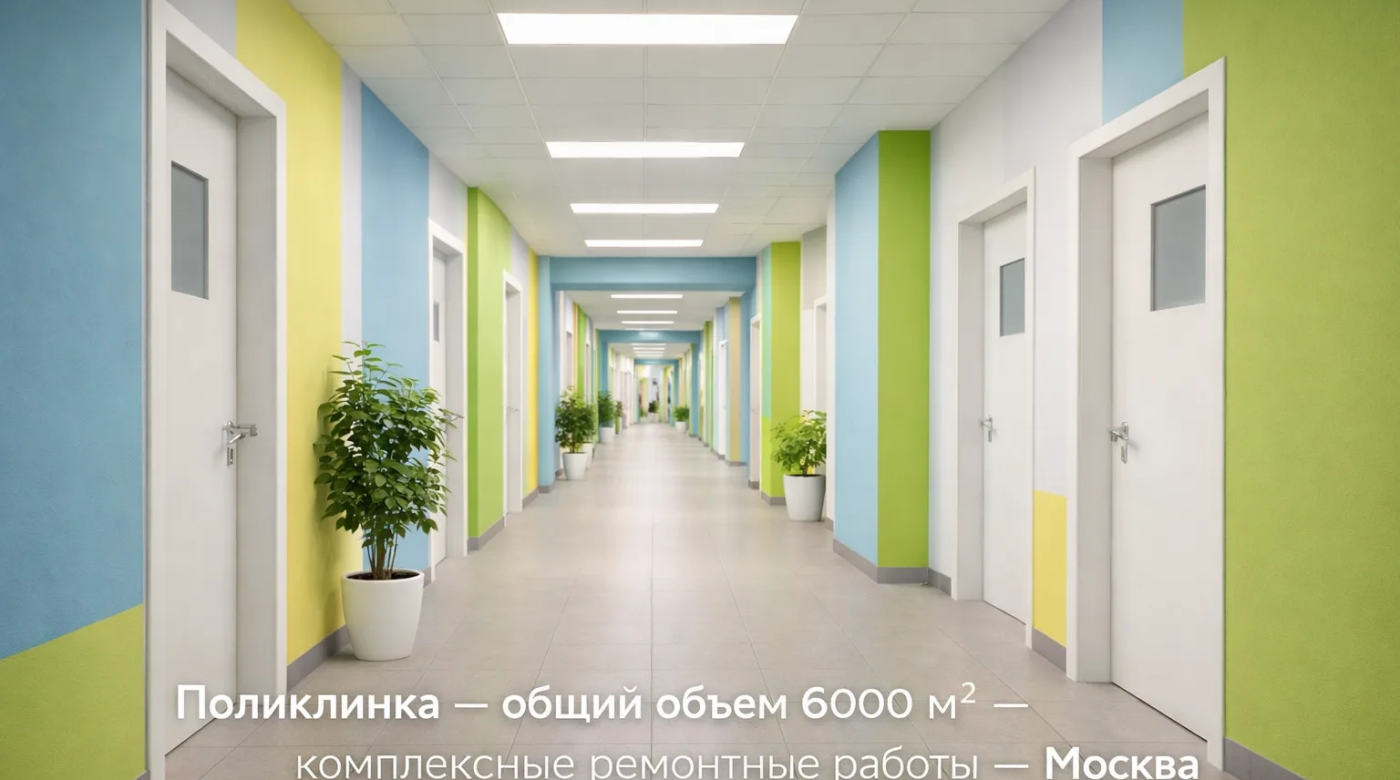 Поликлиника в Хамовниках — один из центральных районов Москвы. Полная реконструкция без пациентов. 6 000 м², несколько цветов по всему объекту, высокие требования к качеству поверхностей.