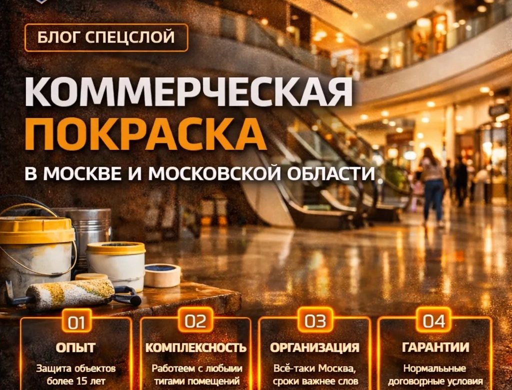 СПЕЦСЛОЙ выполняет коммерческую и промышленную покраску объектов в Москве и МО. Работаем с офисами, складами, техзонами, паркингами, торговыми и производственными помещениями. Оставьте заявку — разберём ваш объект и предложим понятную схему работ под реальный режим эксплуатации.