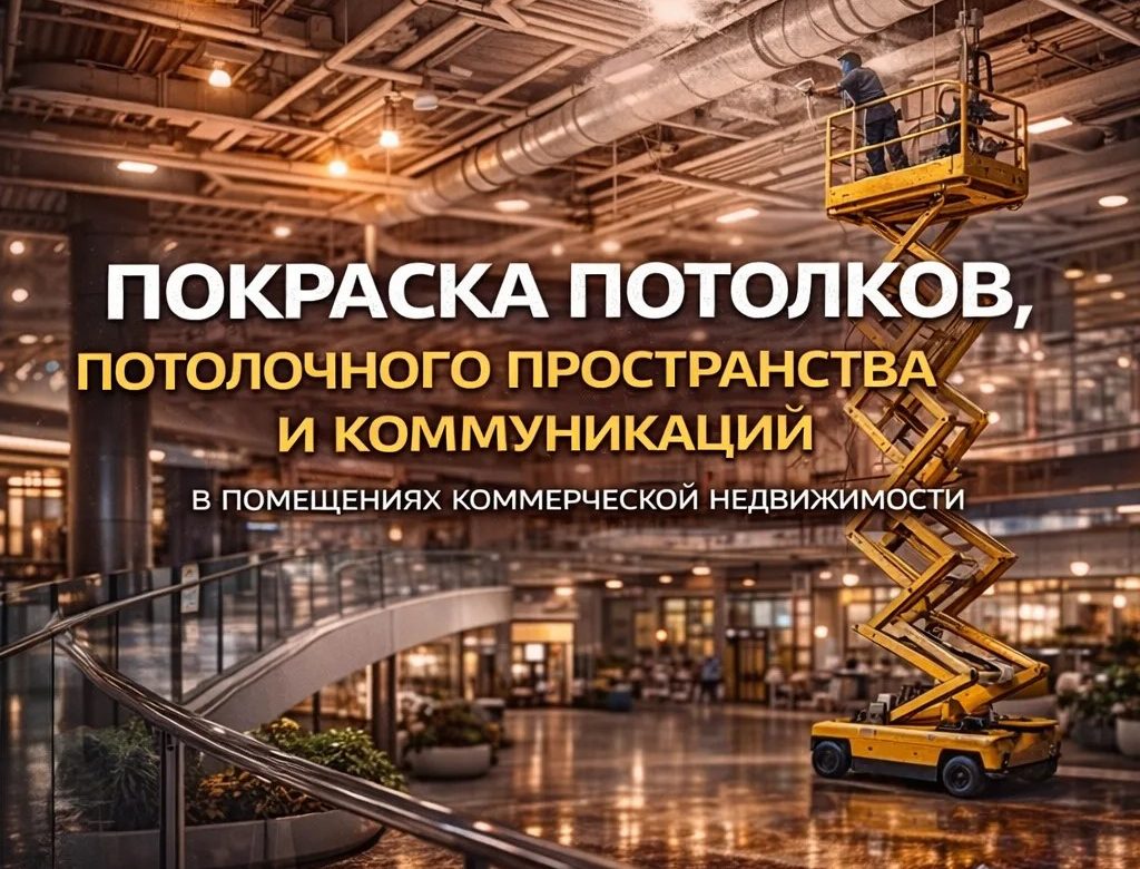 Покраска потолков, потолочного пространства и коммуникаций в помещениях коммерческой недвижимости — это работа, где побеждает не самый быстрый и не самый дешёвый, а тот, кто понимает верхнюю зону как часть самого объекта. Здесь важны не только материал и нанесение, а вся система: анализ пространства, логика коммуникаций, визуальная сборка, организация работ, защита нижних зон и умение пройти объект без лишнего хаоса.