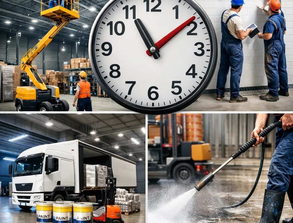 Сроки покраски склада зависят не только от площади. На скорость работ сильно влияют высота, доступ, объём подготовки, режим эксплуатации, поэтапность, насыщенность стеллажами и техникой, а также то, насколько хорошо объект собран организационно до старта.